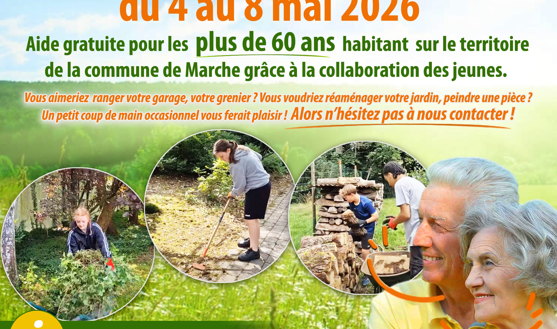 Du 4 au 8 mai, le CPAS de Marche, en collaboration avec d’autres partenaires (Mj de Marche, La Famennoise…), propose l’opération Printemps Solidaire : une aide gratuite pour les plus de 60 ans durant les vacances grâce à la collaboration de jeunes.