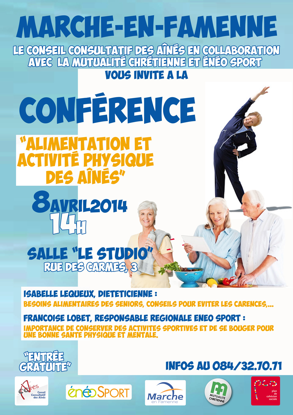 Vous voulez en savoir davantage, en tant que senior, sur l’alimentation et l’activité physique? Le Conseil consultatif des aînés, en collaboration avec la Mutualité Chrétienne et Enéo Sport, propose une conférence sur ce sujet, le mardi 8 avril, à 14h, à la salle Le Studio (rue des Carmes, 3).