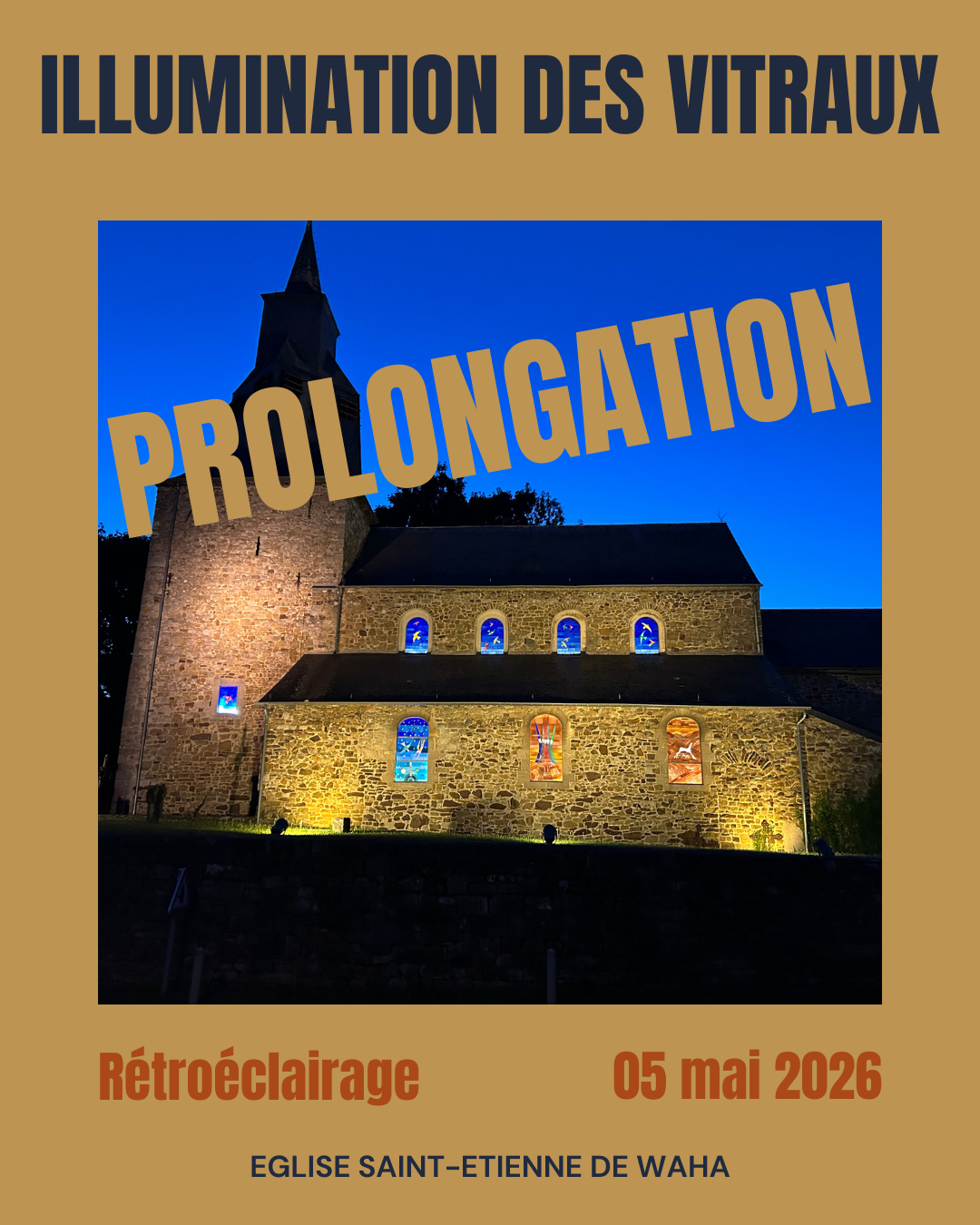 Situés dans l’église Saint-Etienne de Waha, ces vitraux, véritables chefs-d’œuvre de poésie et de lumière, prennent une toute nouvelle dimension à la tombée de la nuit. Le rétroéclairage révèle avec finesse les couleurs, les formes et les messages portés par l’artiste, offrant aux visiteurs une expérience visuelle et émotionnelle unique. À découvrir dès la nuit tombée.
