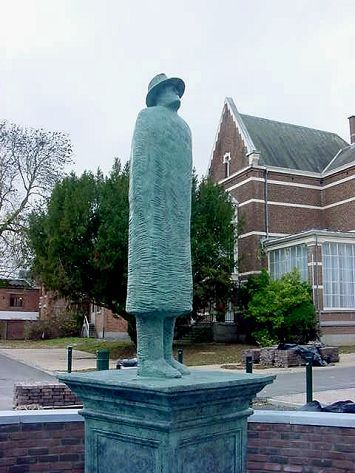 Description de l’œuvre : Œuvre en bronze représentant la silhouette d’un homme à la fois en dehors du monde et en plein dedans; un personnage en dehors du temps qui regarde au loin, dans l’espace mais aussi à l’intérieur de lui-même.